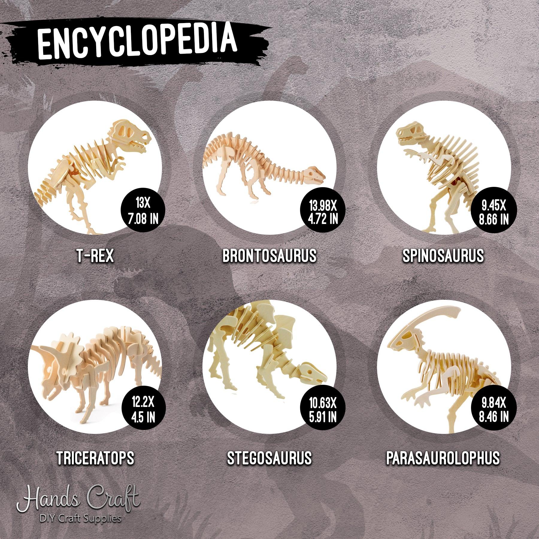 Assortment of 6 DIY 3D wooden dinosaur puzzles. Bundle pack includes a T-Rex, Brontosaurus, Spinosaurus, Triceratops, Stegosaurus, and Parasaurolophus