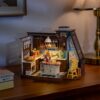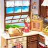 Step into the heart of home with this DIY miniature house kit! Featuring classic brown cabinets, a sleek espresso machine, and a central kitchen island, this kit captures the essence of a welcoming, well-loved kitchen. The delightful baking set-up includes tiny utensils, mixing bowls, and fresh-from-the-oven details that make it feel like someone just finished whipping up a batch of cookies.