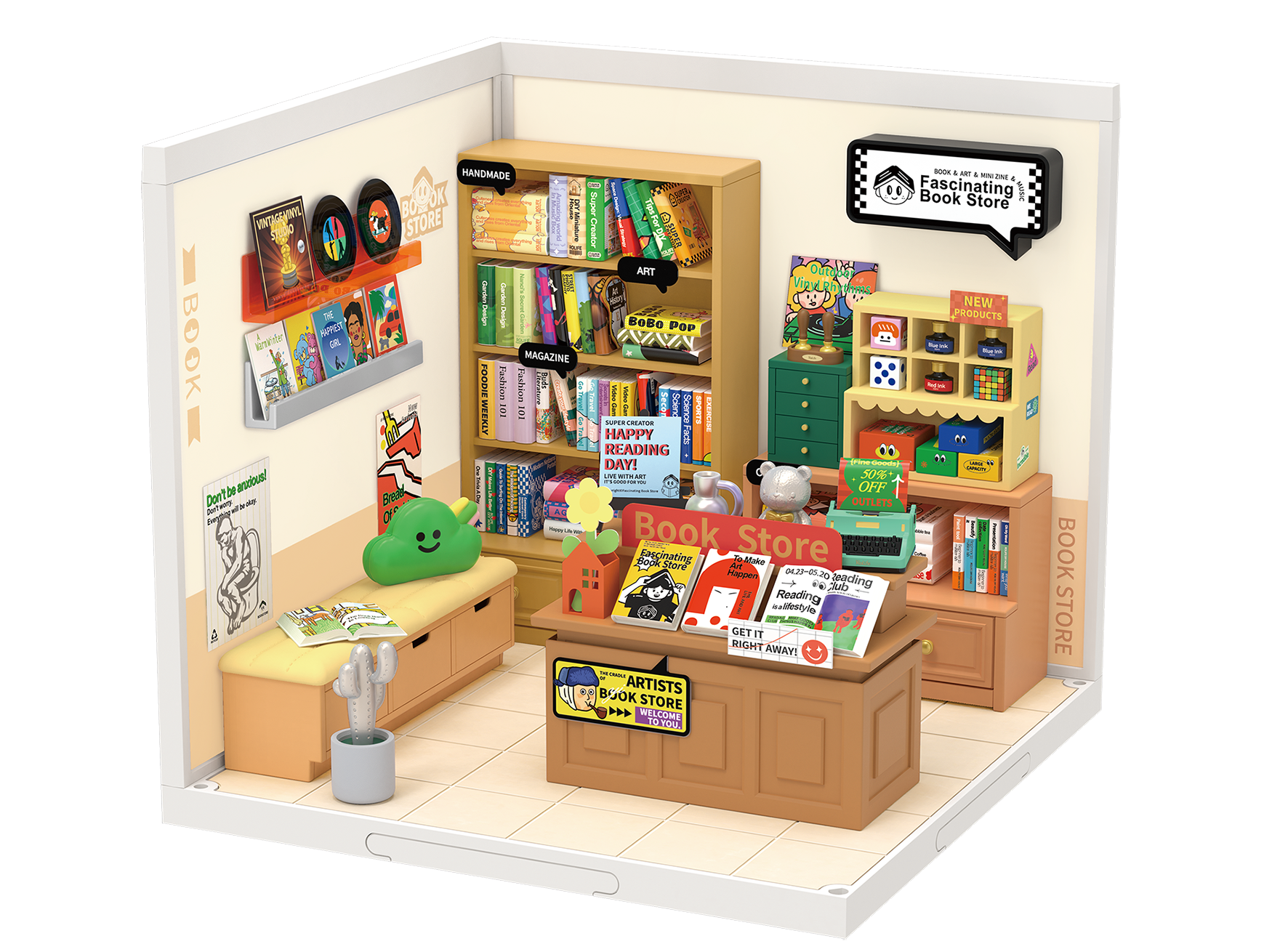 [ROOM SERIES] This miniature is a part of the plastic and modular Room series. Mix and match with other rooms or stores from this series to create a stackable tower or horizontal street full of bustling stores and quaint living spaces. Each product is made of 3 boards and can be stacked horizontally, vertically, or both forming an L-shape. [AMBIENT LIGHT] Light up your room with these miniatures, which comes with lighting and a battery that is neatly hidden in plain sight. Turn on and off the switch by short pressing the button and adjust the brightness by long pressing it. [EASY ASSEMBLY] Our easiest miniatures yet, these kits are made of durable plastic and don’t require any gluing or painting. Perfect for beginners and those who want an easy build, the Super Store series make great gifts for any occasion.**ROOF & DOORS SOLD SEPARATELY**